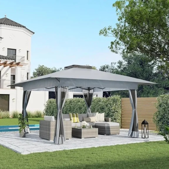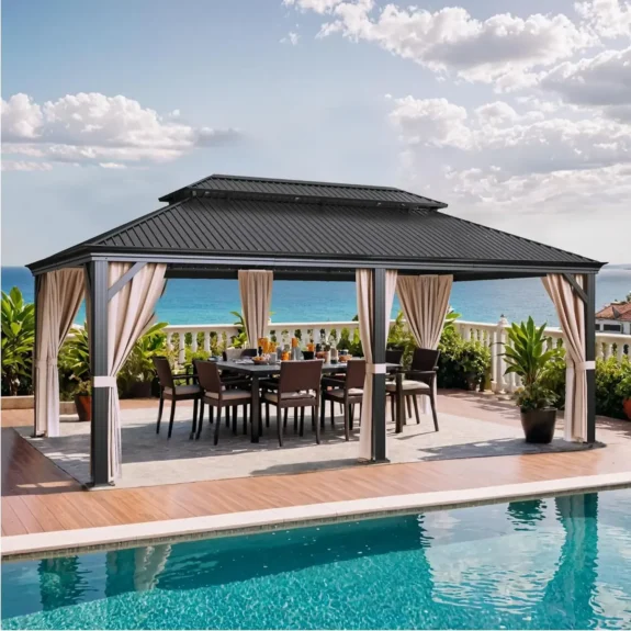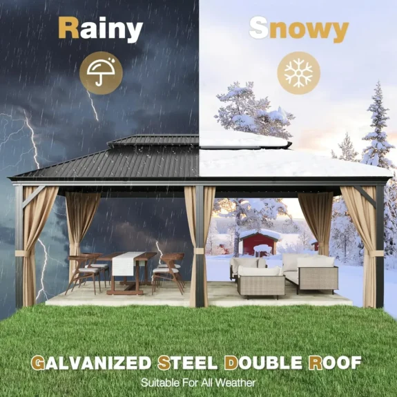 Hardtop Double Roof Gazebo with Netting and Shaded Curtains